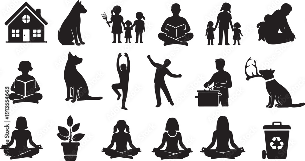 Obraz na płótnie Canvas - Black silhouettes of people and pets in various activities.