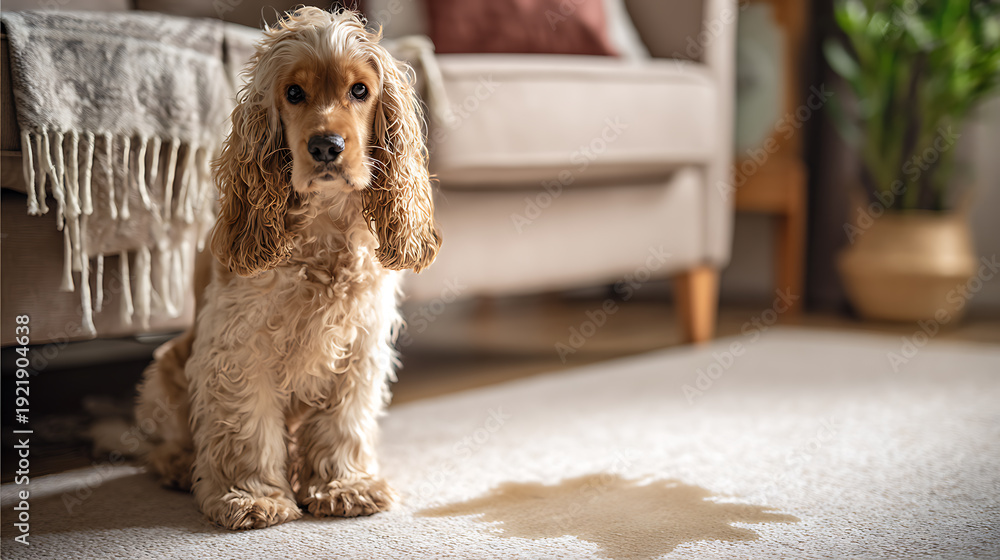 Obraz na płótnie Canvas - Adorable Cocker Spaniel sits patiently on a light-colored carpet indoors, an accidental liquid spill stains the rug in the foreground, highlighting pet behavior.