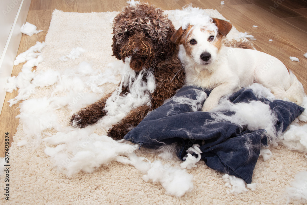 Obraz na płótnie Canvas - Dog mischief. Two dogs with innocent expression after destroy a pillow. separation anxiety and obedience training concept..
