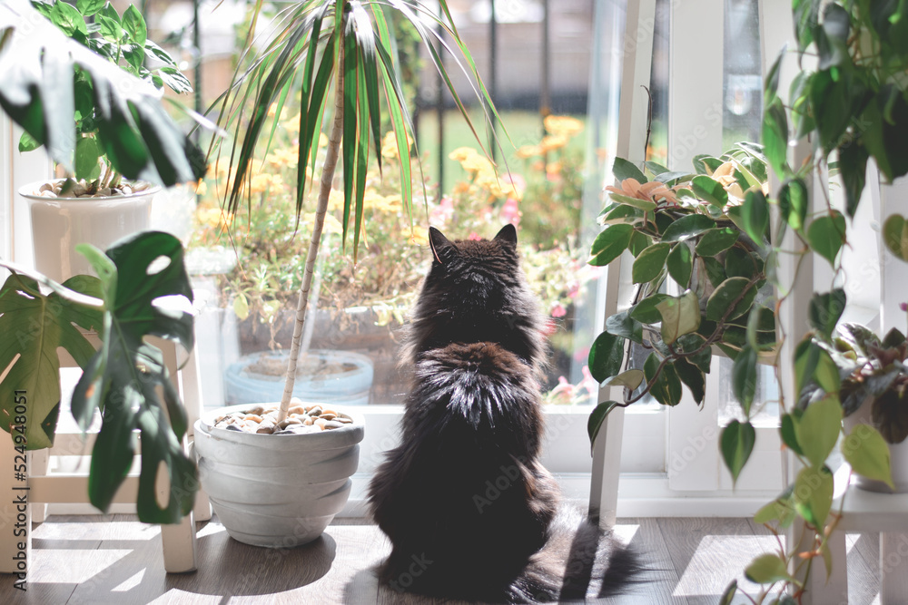 Obraz na płótnie Canvas - Black cat from behind sitting among houseplants looking out the window.