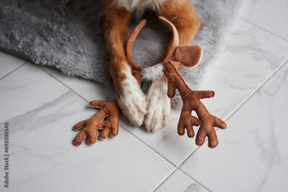 Obraz na płótnie Canvas - dog with reindeer antlers rests on a cozy rug, capturing the essence of Christmas spirit. The playful accessory hints at holiday fun.