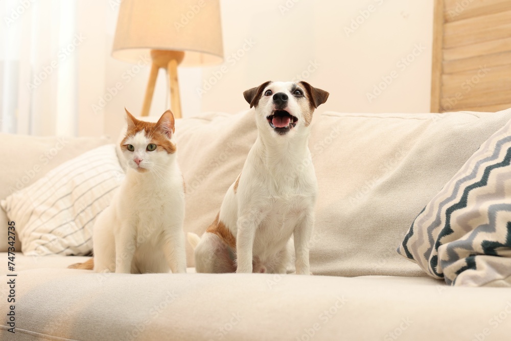 Obraz na płótnie Canvas - Cute cat and dog on sofa at home. Lovely pets.