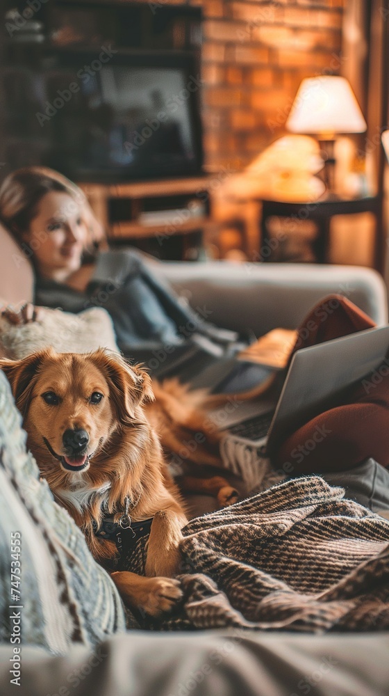Obraz na płótnie Canvas - Couple chill dog love home lifestyle dwelling laptop leisure.