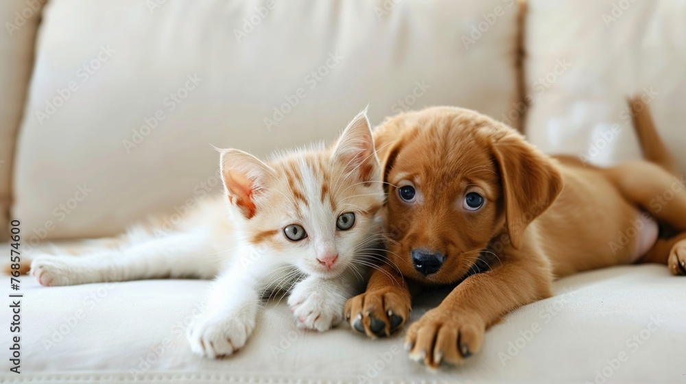 Obraz na płótnie Canvas - Cute little kitten and puppy on sofa at home, closeup..