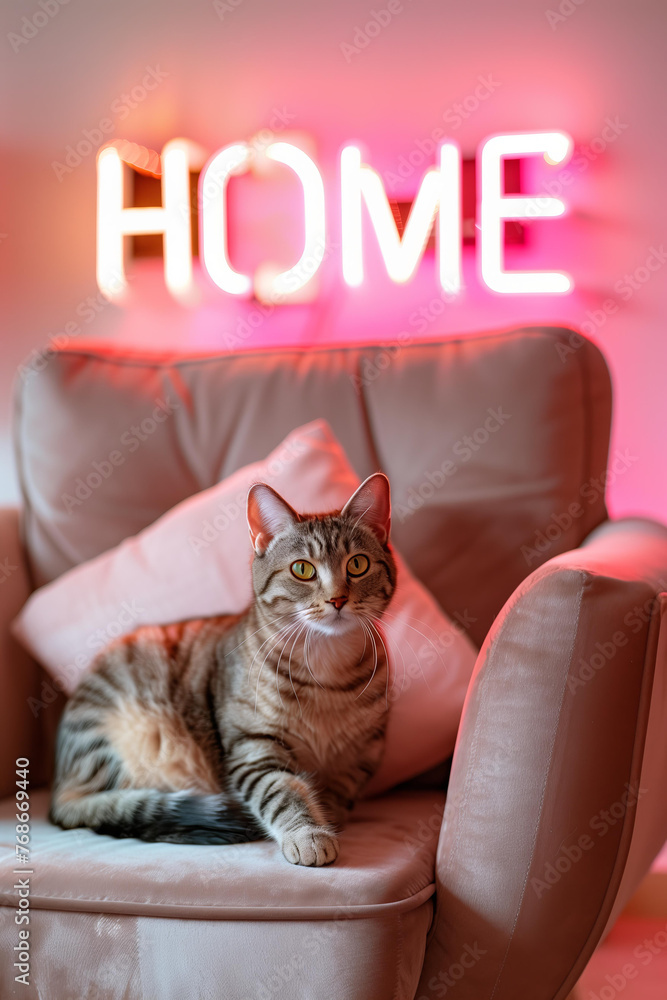Obraz na płótnie Canvas - A cute cat is sitting on the beige velvet armchair in front of neon sign with word HOME, light pastel colors, minimalistic scandinavian cozy interior design.