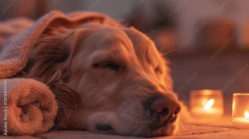 Obraz na płótnie Canvas - Golden retriever relaxing with candles, suited for wellness and therapeutic animal content..