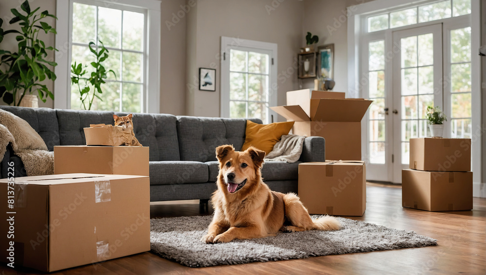Obraz na płótnie Canvas - Pets dog moving to new home. Stack of cardboard boxes and dog sitting near cardboard box. Relocation, renovation, delivery service, donation concept.
