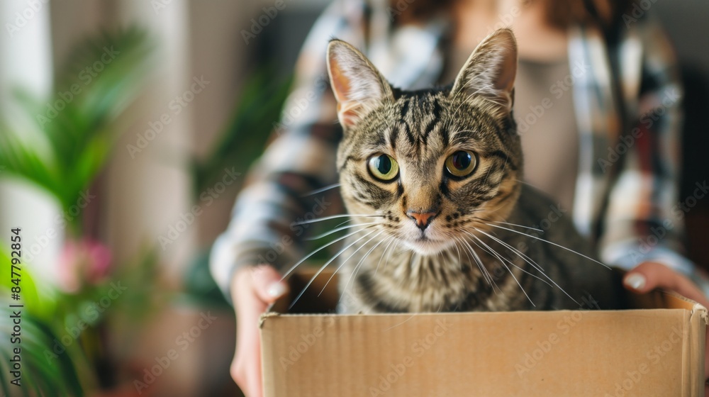 Obraz na płótnie Canvas - Curious cat peeking from cardboard box, adopted to a new home.
