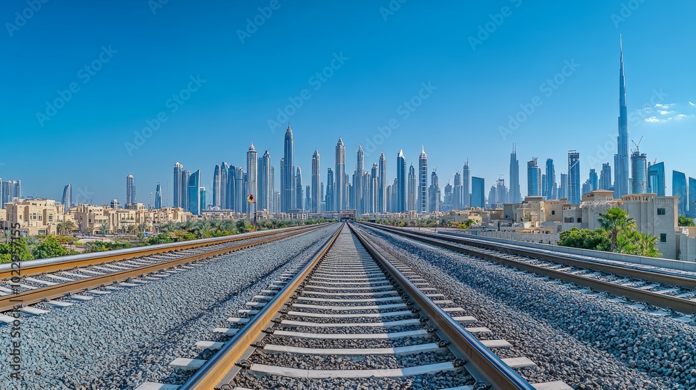 Obraz na płótnie Canvas - A view of the Dubai skyline from the train tracks, with clear blue skies and sunshine..