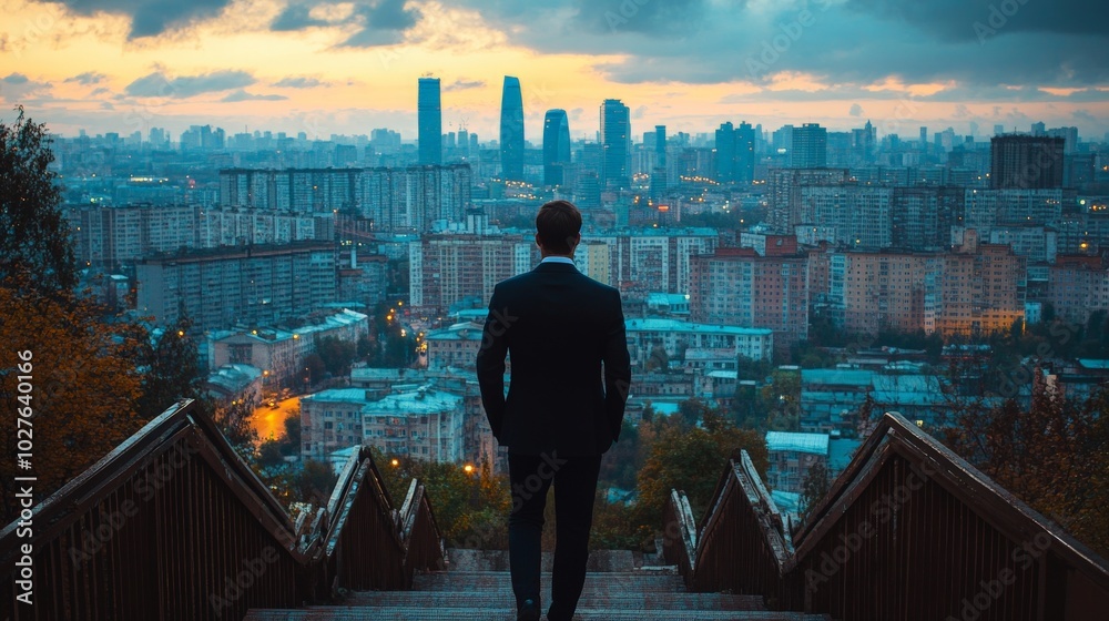 Obraz na płótnie Canvas - Rear view of a businessman climbing stairs leading to a large city.