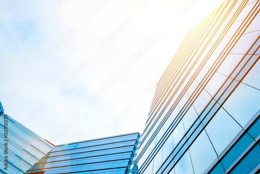 >Obrazy na płótnie Canvas>Business concept for real estate and corporate construction - looking up view in financial district, the silhouettes of skyscrapers city reflect blue sky, sun lights