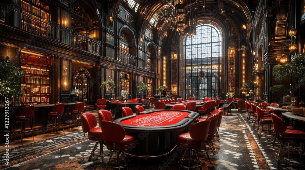 Obraz na płótnie Canvas - Luxurious casino interior, grand hall, game tables, city view.