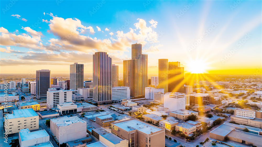 >Obrazy na płótnie Canvas>A vibrant city skyline with modern buildings bathed in warm golden sunlight. The urban scene captures the dynamic energy and growth of a thriving metropolis.