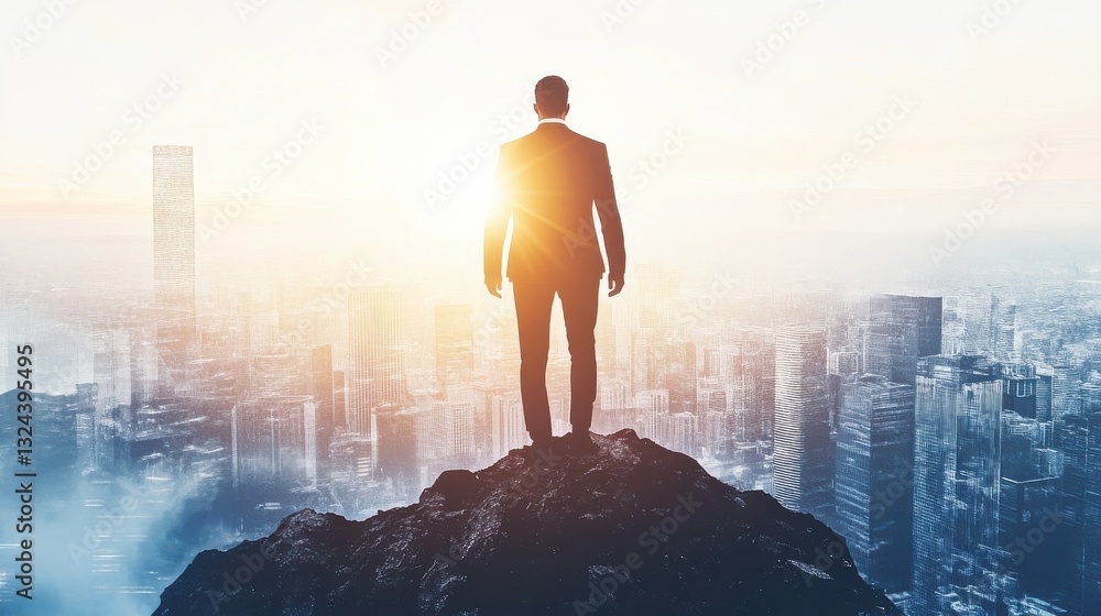 >Obrazy na płótnie Canvas>Back view of successful businessman on mountain top. Leadership and future concept. Abstract city background with sunlight and silhoutte. Double exposure