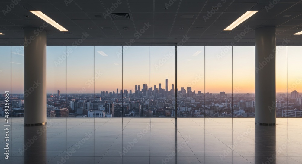 Obraz na płótnie Canvas - Modern office space with cityscape view at sunset provides inspiration.