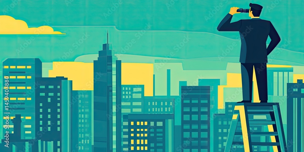 Obraz na płótnie Canvas - Businessman with binoculars surveys cityscape.