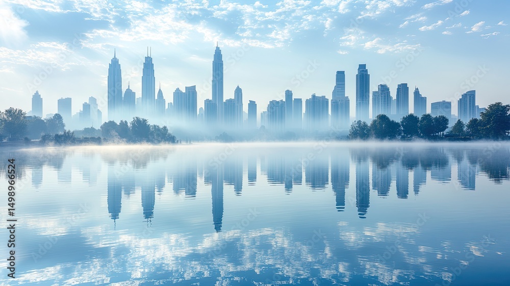 Obraz na płótnie Canvas - Misty city skyline reflected in calm lake at dawn.