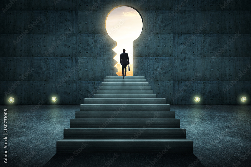 Obraz na płótnie Canvas - Sucess businessman climbing on stair against conrete wall with key hole door ,sunrise scene city skyline outdoor view ..