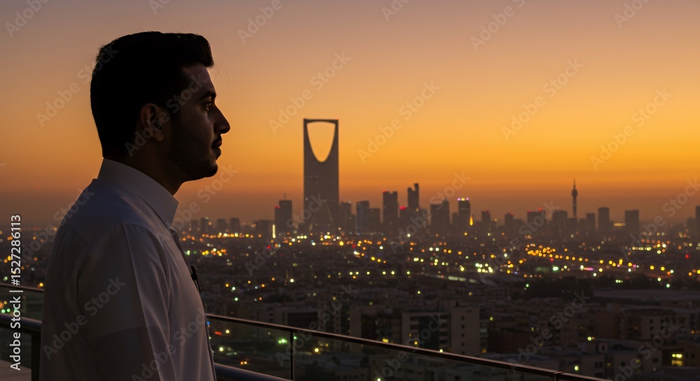 Obraz na płótnie Canvas - Silhouette of a Man Contemplating Riyadh's Skyline at Sunset.