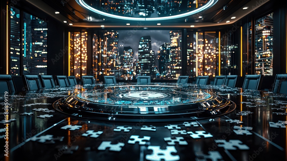 Obraz na płótnie Canvas - Dark, futuristic conference room with city view.