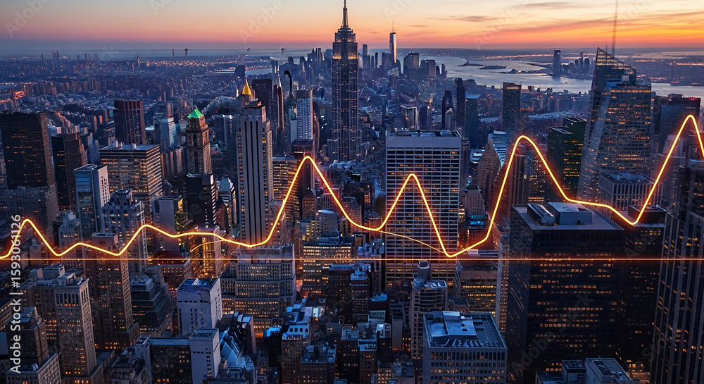 >Obrazy na płótnie Canvas>Aerial cityscape view at sunset, showcasing illuminated buildings with an overlaid glowing line graph, symbolizing urban growth and economic trends