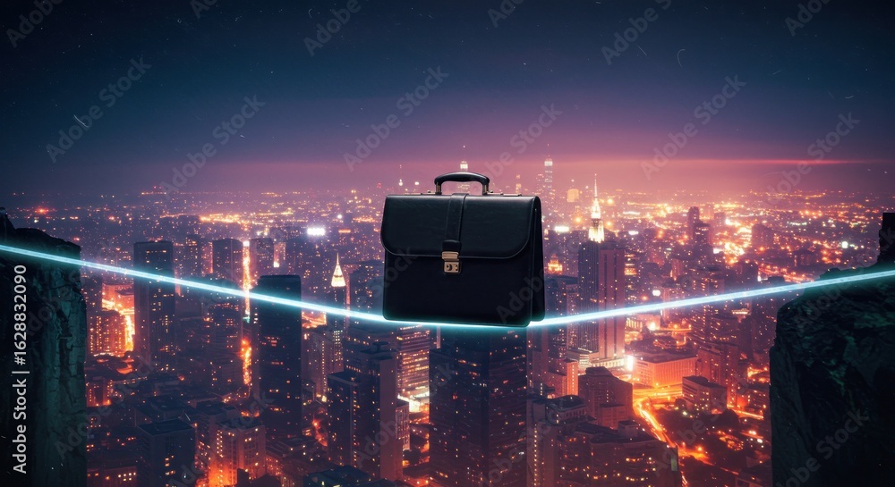 Obraz na płótnie Canvas - Business briefcase on a wire over city.