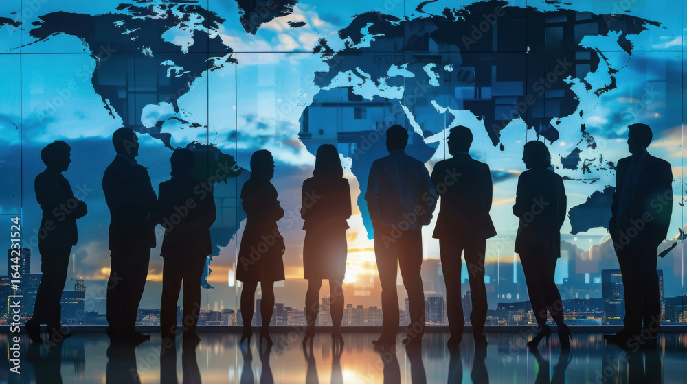 Obraz na płótnie Canvas - Silhouette of business team standing before a world map in a modern office space with city view.