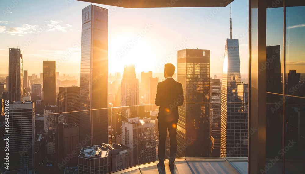 Obraz na płótnie Canvas - Businessman Standing on Rooftop Overlooking City Skyline at Sunset Wearing Formal Attire.