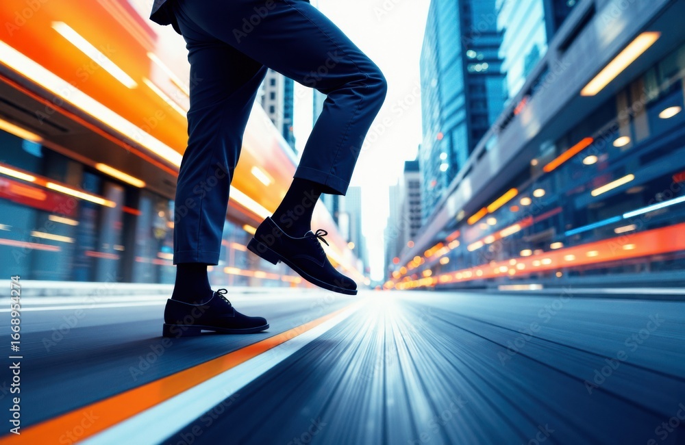 Obraz na płótnie Canvas - Businessman crossing street in a busy city with motion blur and vibrant lights.