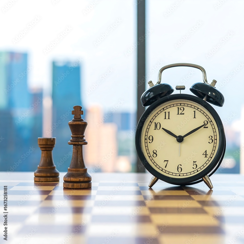 Obraz na płótnie Canvas - Chess pieces and clock on a chessboard with city view.