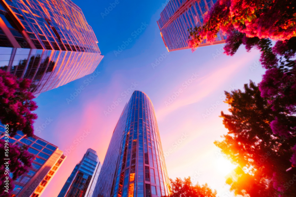 >Obrazy na płótnie Canvas>A dynamic lowangle view of towering city skyscrapers at sunrise with a vibrant sky symbolizing urban growth ambition and modern life