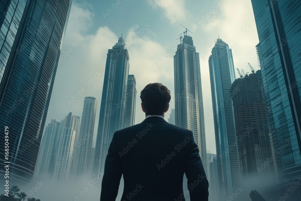 Obraz na płótnie Canvas - Man in suit looking up at tall buildings and cloudy sky in a modern city landscape view from behind.