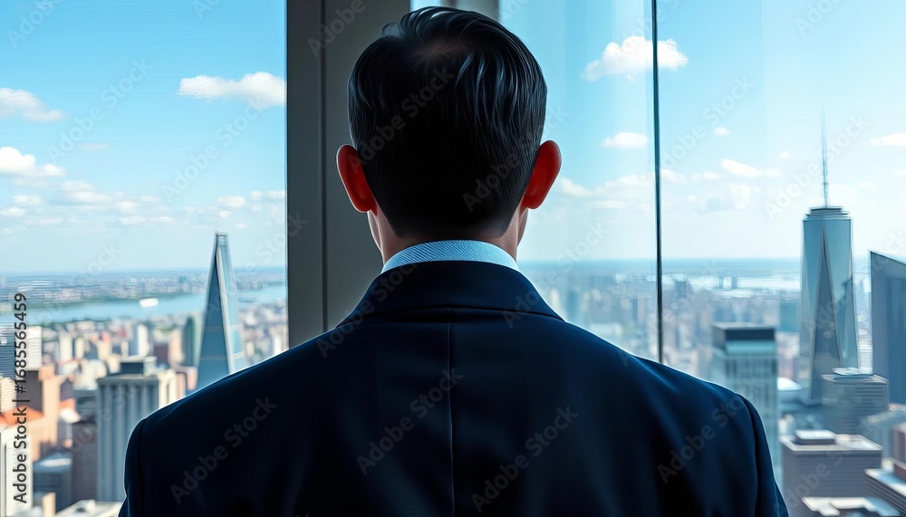 Obraz na płótnie Canvas - Back view of a figure in business attire gazing at cityscape from modern skyscraper, high-rise, technology.