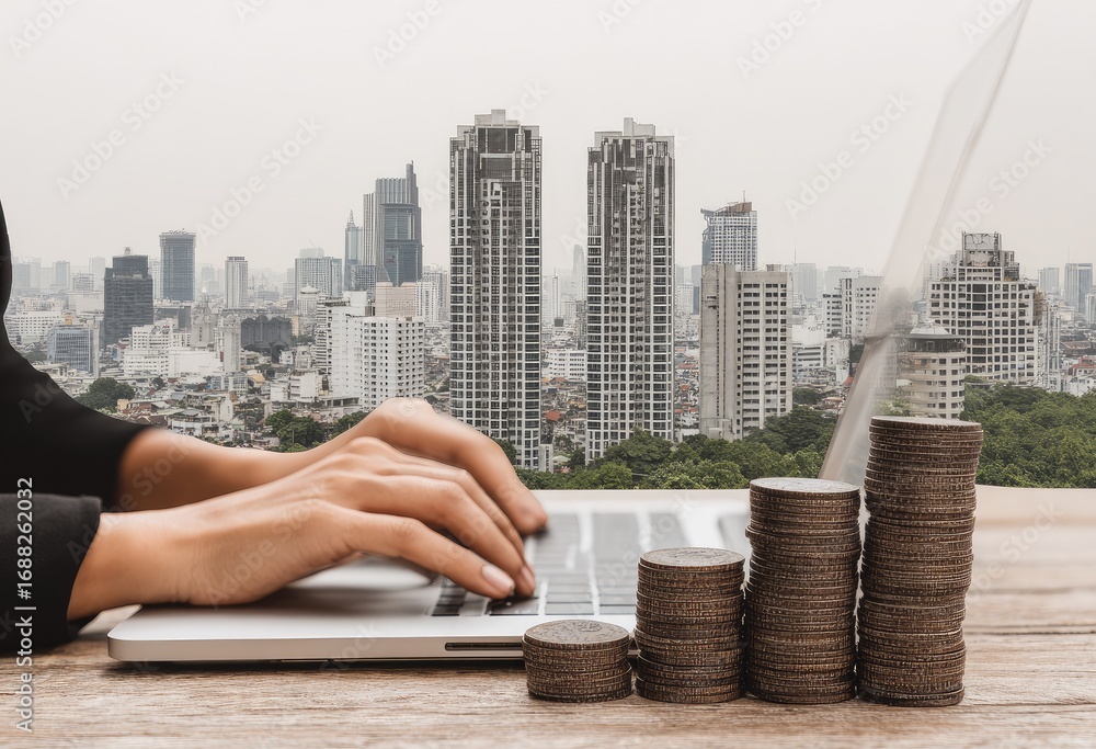 Obraz na płótnie Canvas - Hands typing on laptop, stacks of coins, city view.
