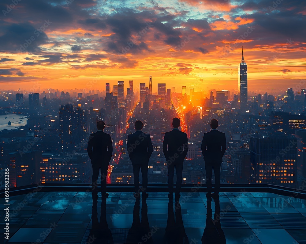 Obraz na płótnie Canvas - Four businessmen stand on a rooftop overlooking a city skyline at sunset symbolizing ambition and success.
