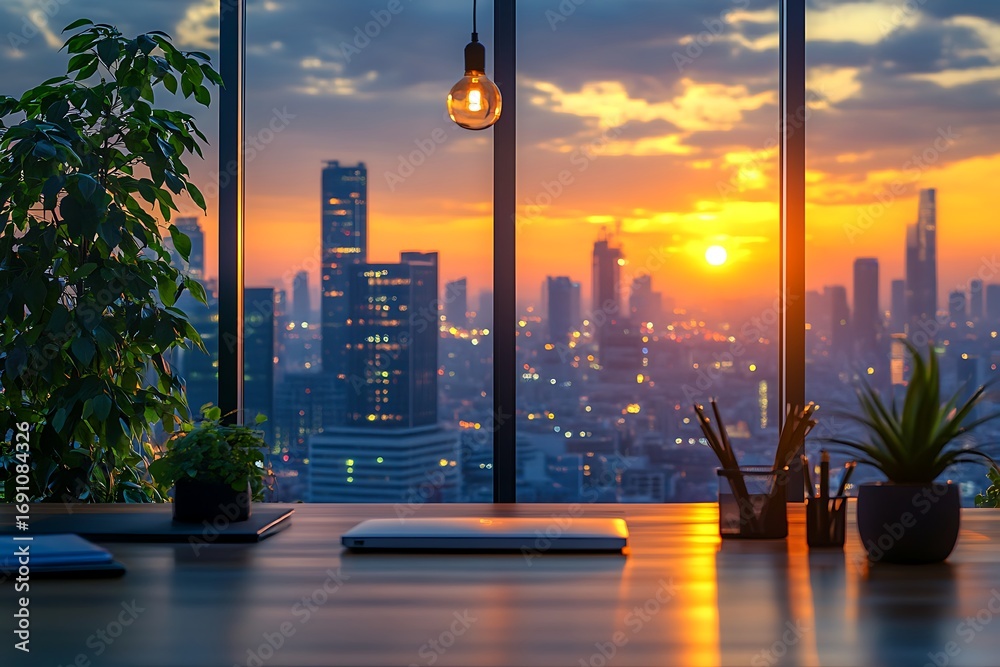 Obraz na płótnie Canvas - Stunning sunset view from modern office workspace with city skyline, creating success..