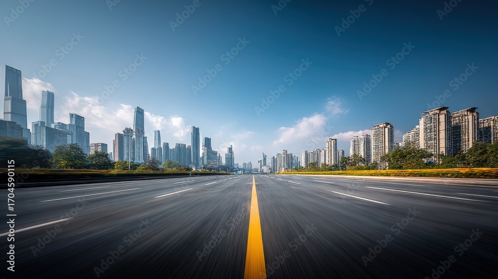 Obraz na płótnie Canvas - Cityscape Horizon View: Modern Skyline Perspective with Asphalt Road and Clear Blue Sky Backdrop.