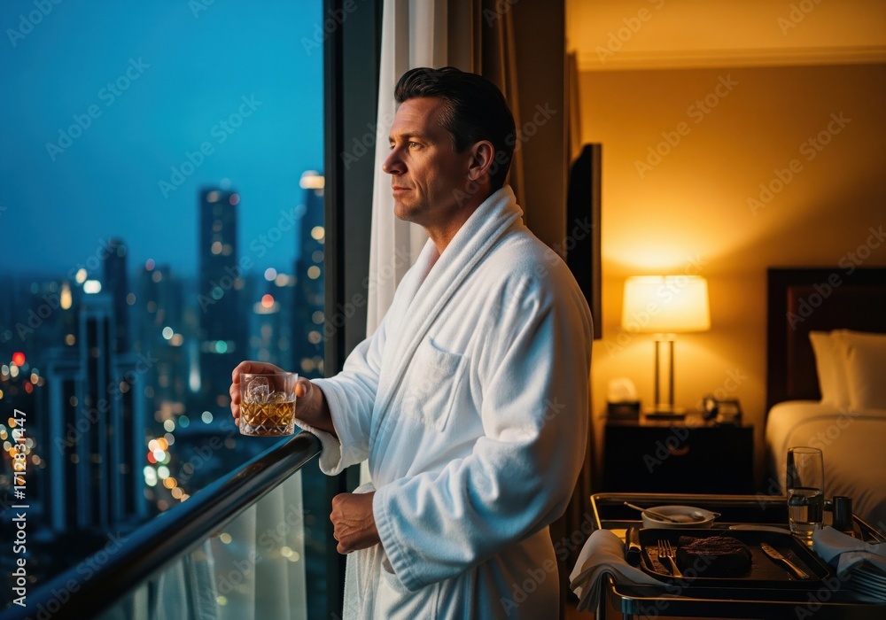 Obraz na płótnie Canvas - Man in bathrobe with whiskey looking at city from luxury hotel room.