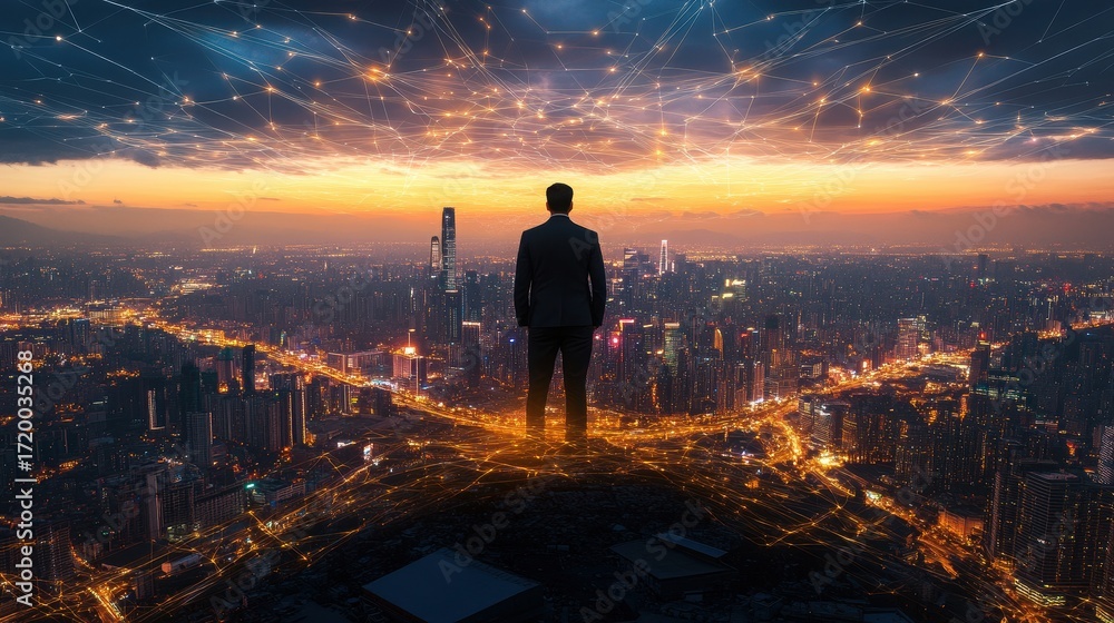 Obraz na płótnie Canvas - A man in a suit stands overlooking a cityscape at dusk with a network overlay above the city lights.