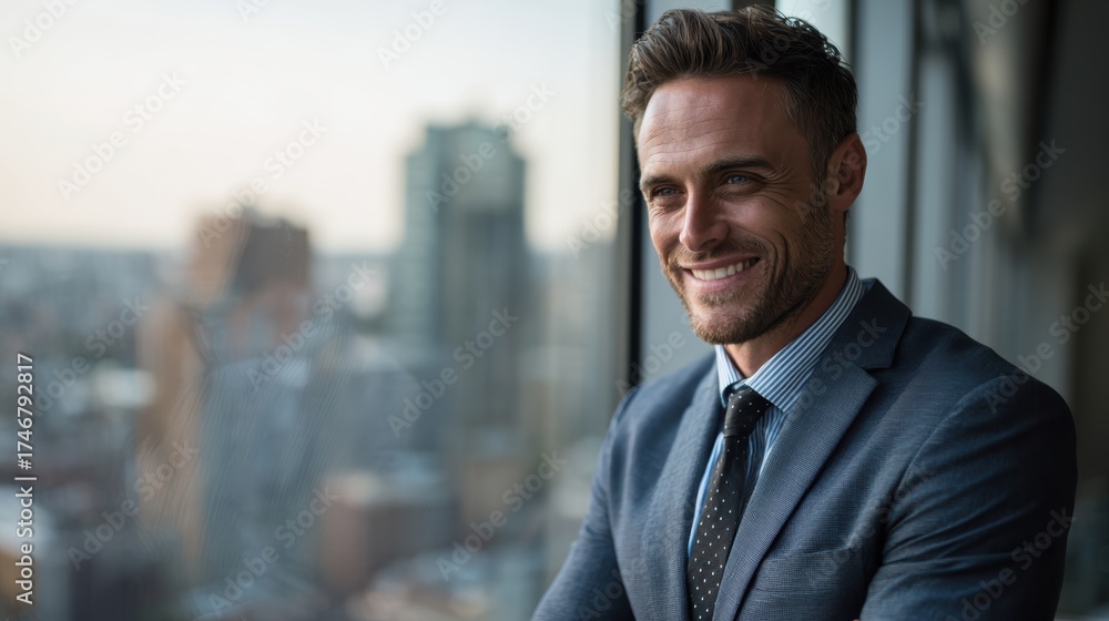 Obraz na płótnie Canvas - Confident businessman standing in an office with a city view, smiling as he looks out over the skyline..