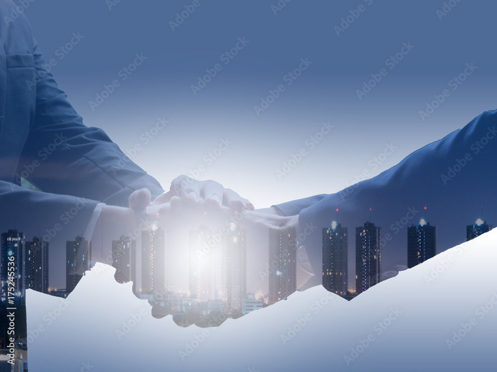 Obraz na płótnie Canvas - double exposure business man shanking hands and city night view.
