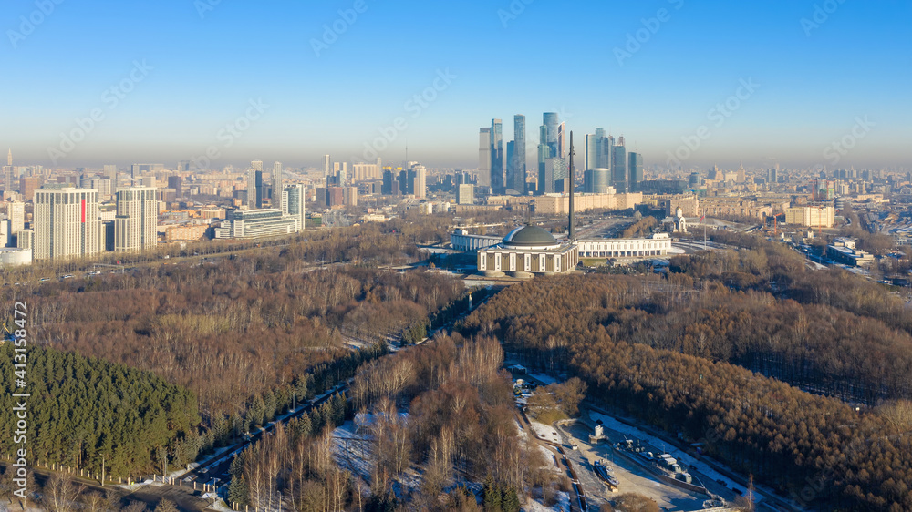 Obraz na płótnie Canvas - Aerial view of Moscow, Victory park and Moscow city at sunny winter day. Russia..