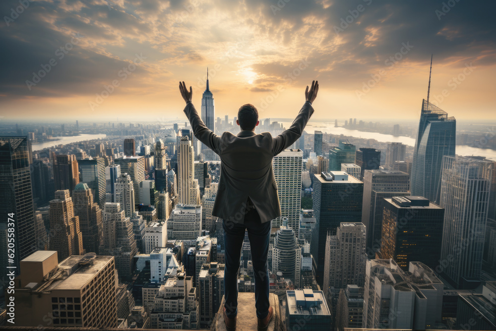 >Obrazy na płótnie Canvas> Successful businessman raising his arms like a winner standing on roof of office building with city view. Concept of business success and victory.