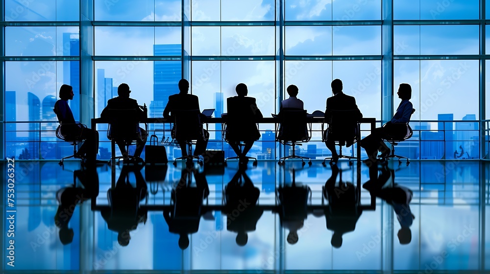 >Obrazy na płótnie Canvas>A group of business people are sitting around a table in a conference room. They are looking at the city view outside the window.