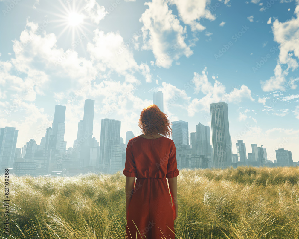 Obraz na płótnie Canvas - back-view , Lonely woman standing in a field of wheat looking at a city on the horizon..