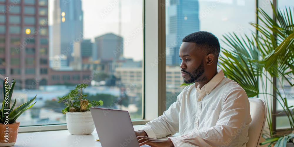 Obraz na płótnie Canvas - a Black entrepreneur working on a laptop in a minimalist office with a view of the city skyline.