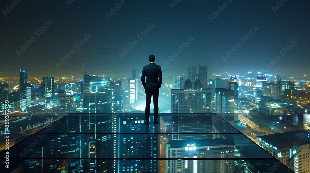 >Obrazy na płótnie Canvas>Businessman standing at transparent glass floor on rooftop with night Smart city panoramic view Business success with smart technology concept : Generative AI