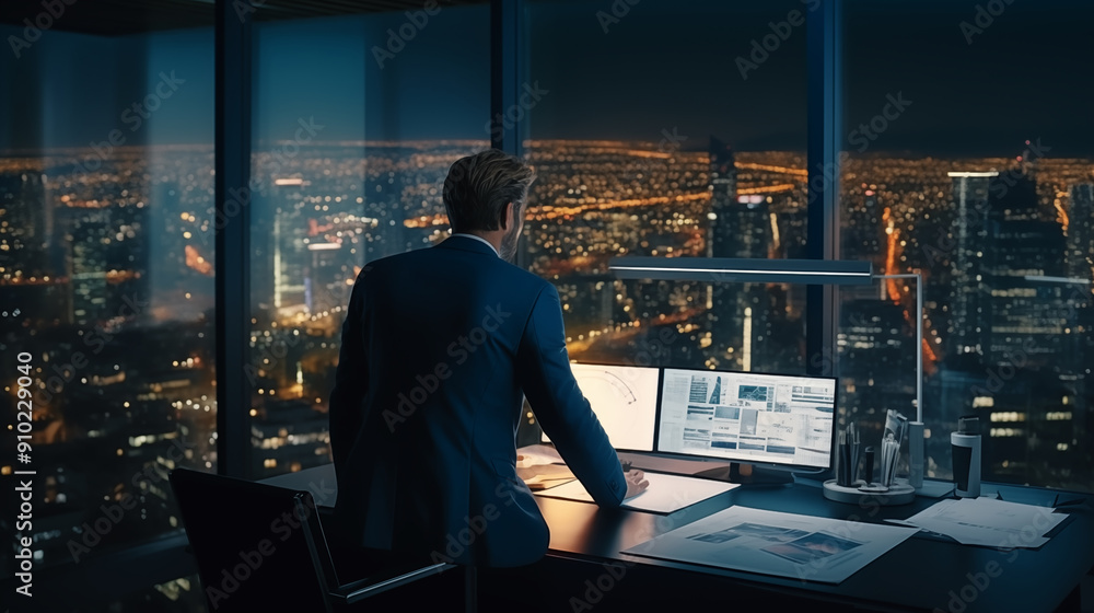 Obraz na płótnie Canvas - Elegant Businessman Analyzing Charts for Optimal Investments. Man working late at night with stunning view on city.