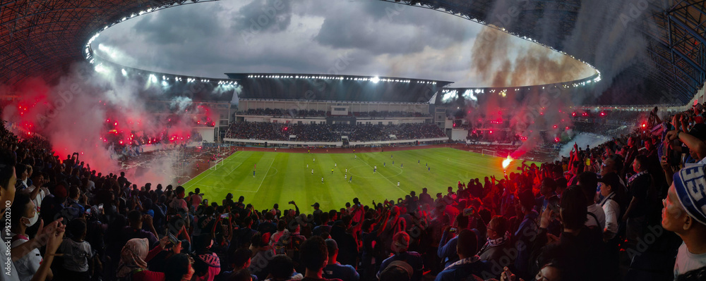 Obraz na płótnie Canvas - Panoramic wide-angle view inside the Stadion Jatidiri, Semarang after win celebration, home stadium for PSIS Semarang..