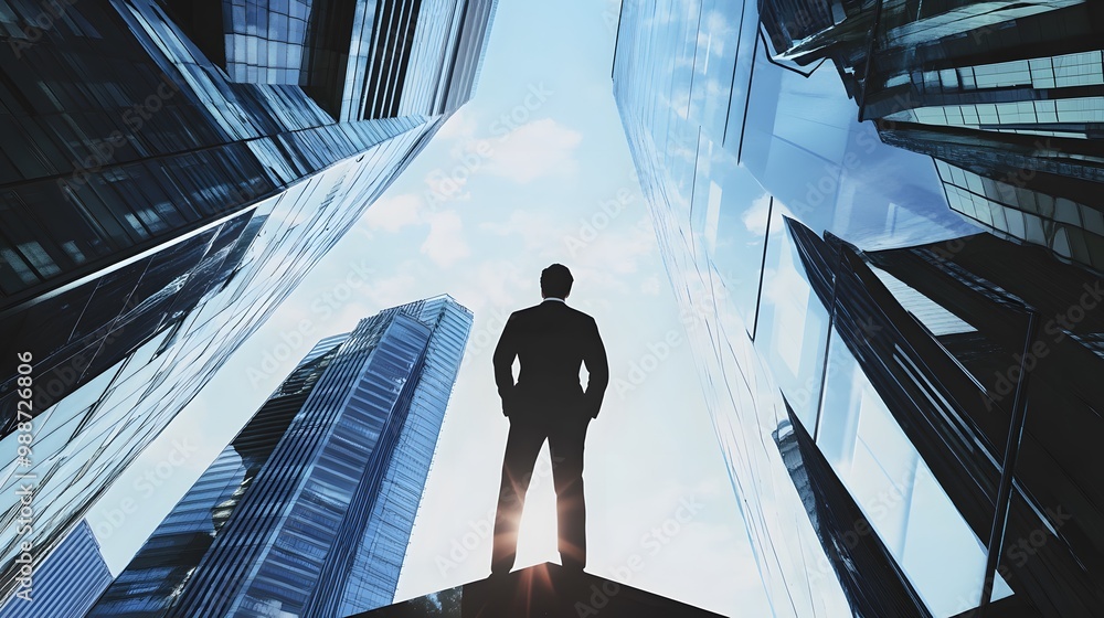 Obraz na płótnie Canvas - Silhouette of a businessman standing tall, looking up at the skyscrapers..